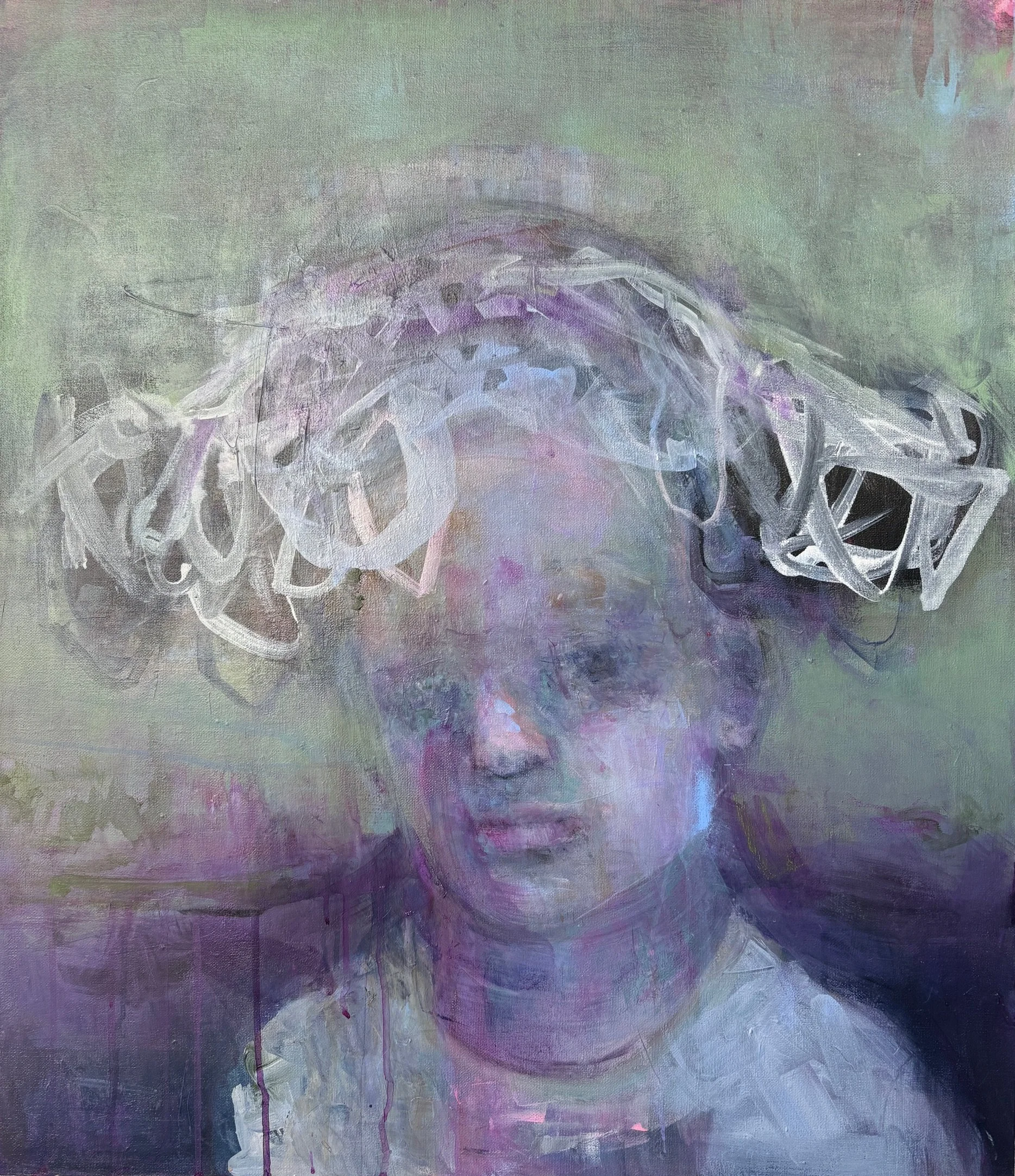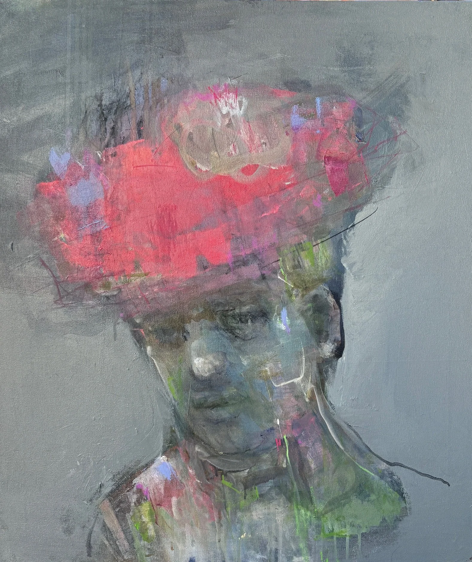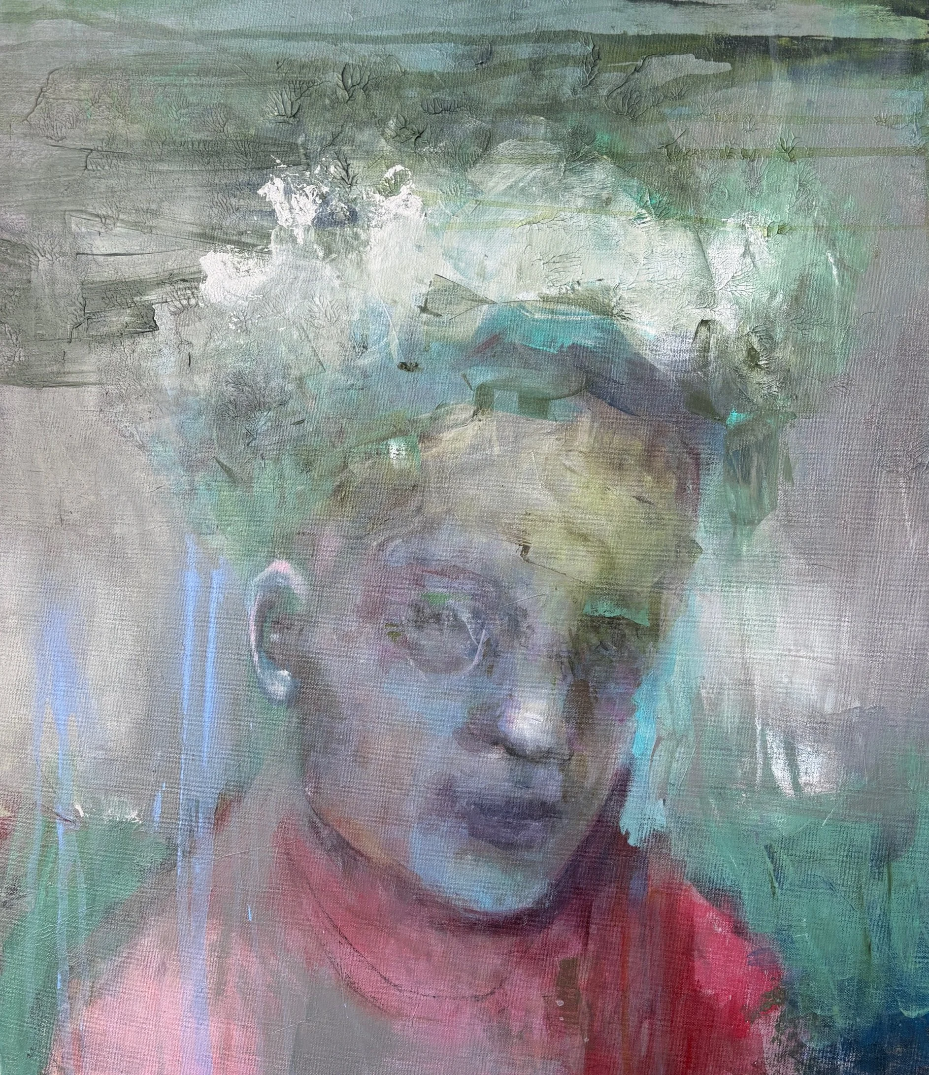 Det udløser overmaling, lag og impulsivt frustrerede penselstrøg og giver til sidst balancen mellem grafisk udtryk, levende intensitet og følelsesmæssig mæthed, der afgør, at maleriet er færdigt.