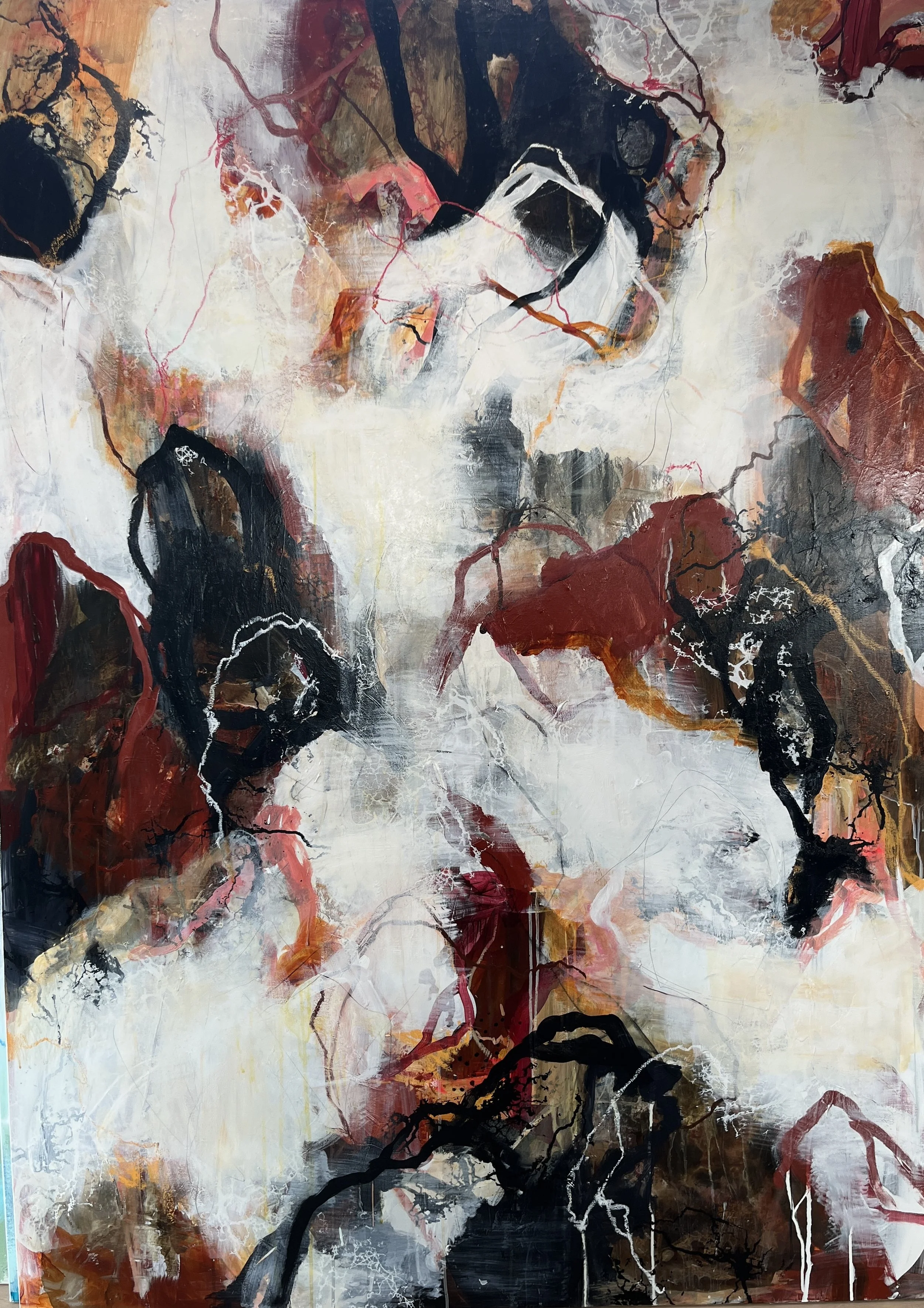 Rie har en umiddelbar ekspressiv tilgang når hun maler sine værker og nyder det spontane og eksperimenterende i processerne.